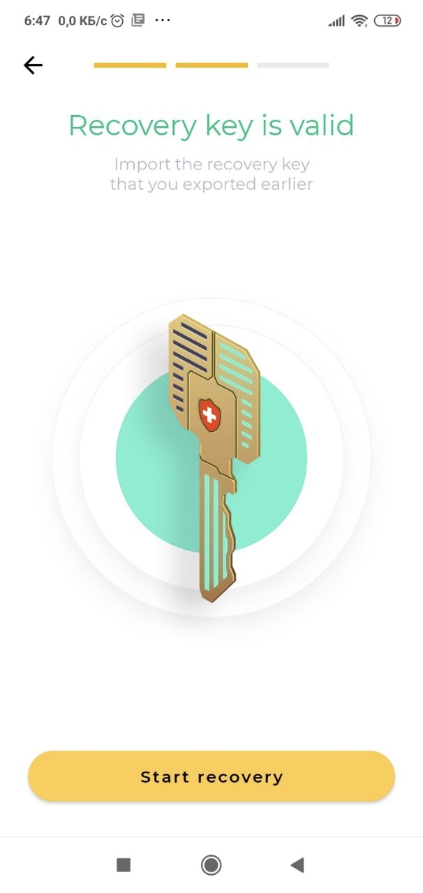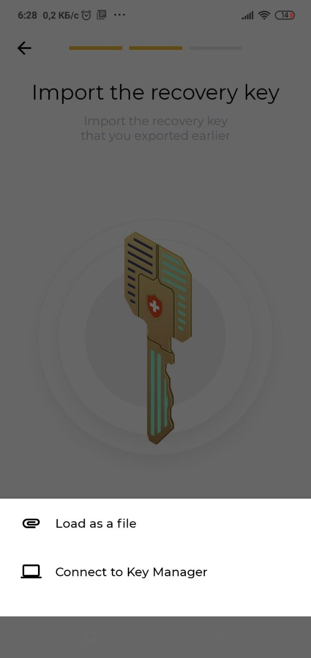 For the recovery procedure, you need to import the recovery key. If the recovery key had been uploaded as a file, it should be downloaded using the phone’s operating system. If the key had been exported to Key Manager, select Connect to Key Manager, and connect using a QR code.